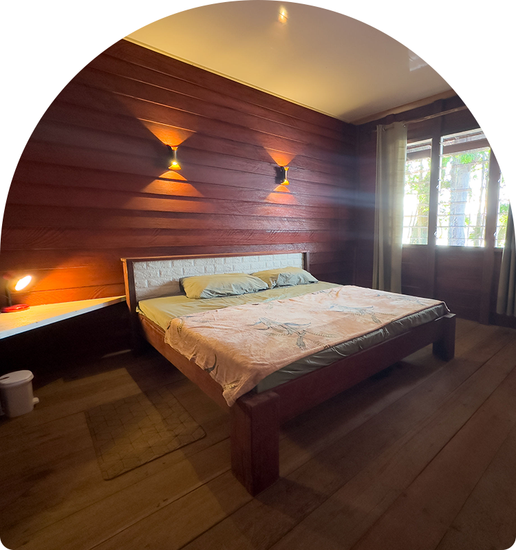 The rooms at Apetina Eco River Resort provide a warm and rustic experience that perfectly complements the natural surroundings. The wooden interior of the suites, as shown in the picture, features a cozy atmosphere with polished timber walls and floors, exuding an authentic jungle lodge charm. The spacious bed is set against a backdrop of natural materials, illuminated by soft, ambient lighting from wall-mounted lamps, which adds to the room’s relaxed vibe.