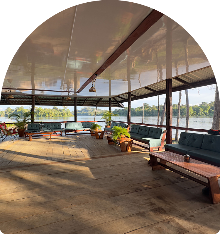 The river itself is a highlight of the resort, with its calm waters reflecting the vibrant greenery of the rainforest. Whether you’re enjoying a peaceful morning coffee or watching the sunset in the evening, the Tapanahony River provides a breathtaking backdrop to your stay. The lounge’s comfortable couches and spacious layout make it an ideal spot for socializing with fellow travelers, reading a book, or simply gazing at the flowing river and the lush jungle beyond.